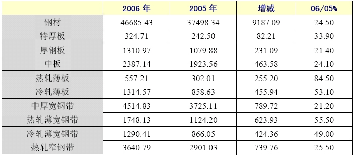 從分品種看,2006年產(chǎn)量增幅最大的板材是熱軋薄板、熱軋薄寬鋼帶、冷軋薄板、冷軋薄寬鋼帶、鍍層板帶,分別同比增長(zhǎng)了84.50%、55.50%、53.10%、49.00%和43.60%。