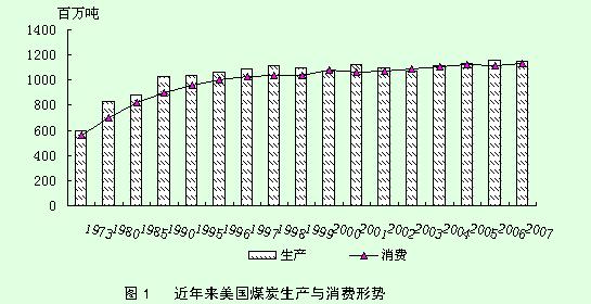 2007年美國煤炭產(chǎn)量略有下降,據(jù)美國能源信息署資料,2007年美國煤炭產(chǎn)量為11.46億噸,比2006年減少0.17億噸,下降1.5%。美國煤炭生產(chǎn)與消費形勢見圖1。
