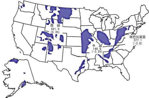 美國的煤炭生產(chǎn)主要集中在西部地區(qū)(圖2),2007年西部地區(qū)的產(chǎn)量達(dá)6.21億噸,占美國總產(chǎn)量的54.2%,主要生產(chǎn)礦山為露天礦;其次阿巴拉契亞(Appalachian)地區(qū)為3.77億噸,占美國總產(chǎn)量的32.9%,主要生產(chǎn)礦山為地下礦;中部地區(qū)的產(chǎn)量為1.47億噸,占美國總產(chǎn)量的12.8%。美國主要地區(qū)煤炭生產(chǎn)見表1。
