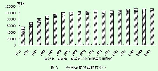美國不僅是世界大的煤炭生產(chǎn)國之一,而且還是世界最大的煤炭消費國之一,從圖3可以看出自第一次石油危機(jī)后美國的煤炭消費量逐年增加。2007年比2006年增加0.17億噸,為11.29億噸,增長1.5%。