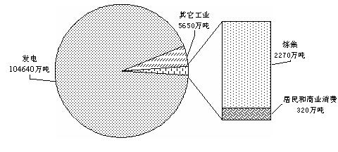美國煤炭消費主要領(lǐng)域為發(fā)電,2007年消費量達(dá)104640萬噸(圖4),約占美國煤炭消費量的92.7%;其次為其它工業(yè),消費量為5650萬噸,占總消費量的5.0%,其中供熱為2410萬噸,占總消費量的2.1%;煉焦為2270萬噸,占總消費量的2.0%;居民和商業(yè)消費為320萬噸,占總消費量的0.3%。