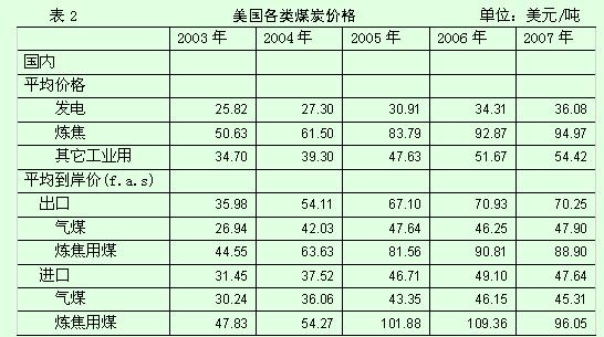 2007年美國各類煤炭價格仍持續(xù)增長(表2)。煉焦用煤價格為94.97美元/噸,比2006年增加2.1美元/噸。