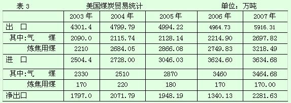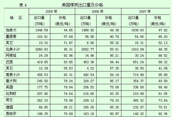 2007年美國的煤炭出口量比2006年增加960萬噸,為5920萬噸,比2006年增長19.4%,平均出口價為70.25美元/噸,比2006年減少0.68美元/噸。2007年美國的煤炭進(jìn)口量達(dá)3630萬噸,比2006年增長0.3%,平均進(jìn)口價為47.64美元/噸,比2006年減少1.46美元/噸。