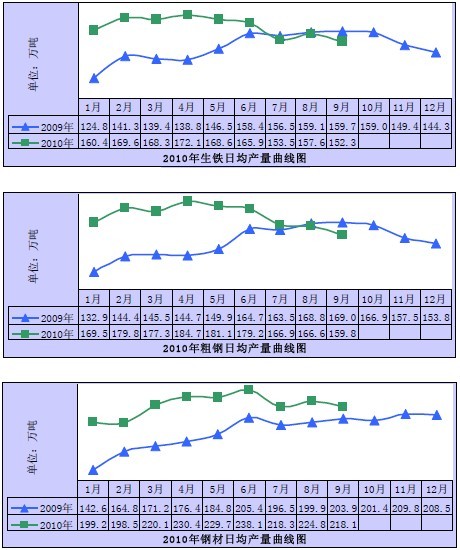 9 月份,鋼鐵行業(yè)為節(jié)能減排限電限產(chǎn)風(fēng)呼嘯而過,產(chǎn)鋼大省河北在限產(chǎn)行動(dòng)中無疑起到了表率的作用,然而臨近月末,復(fù)產(chǎn)企業(yè)增多,產(chǎn)量出現(xiàn)明顯反彈,中鋼協(xié)旬報(bào)顯示,9月下旬其會(huì)員企業(yè)日均產(chǎn)量141.7 萬噸,環(huán)比中旬增長(zhǎng)8.6%。據(jù)悉,國(guó)慶節(jié)前,河南、山東兩省多數(shù)鋼廠接到通知,要求鋼廠在未來的3 個(gè)多月中減產(chǎn)50%,其中,安陽鋼鐵停了兩個(gè)400 立方米的高爐,將影響產(chǎn)量10 萬噸左右。由于兩省鋼產(chǎn)量占全國(guó)比重較小,另外執(zhí)行情況各不相同,10 月限產(chǎn)對(duì)市場(chǎng)影響有限。