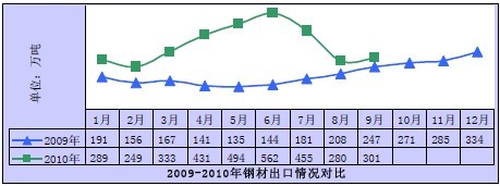 據(jù)海關(guān)快報(bào)統(tǒng)計(jì),9 月份,我國(guó)進(jìn)口鋼材132 萬噸,同比下降30.9%,環(huán)比減少3 萬噸;出口鋼材301 萬噸,同比增長(zhǎng)21.8%,環(huán)比增加21 萬噸;凈出口鋼材169 萬噸,同比增長(zhǎng)2.02 倍,環(huán)比增加24 萬噸;前三季度累計(jì)進(jìn)口鋼材1250 萬噸,同比下降6.57%,累計(jì)出口鋼材3394 萬噸,同比增長(zhǎng)1.16 倍,累計(jì)凈出口2144 萬噸,同比增長(zhǎng)8.2 倍。受國(guó)內(nèi)外價(jià)差減小、退稅政策調(diào)整導(dǎo)致企業(yè)出口成本上升、國(guó)際貿(mào)易保護(hù)主義以及人民幣升值等因素的影響,第四季度出口形勢(shì)仍不容樂觀。