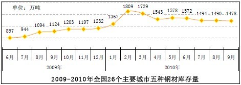 9 月末,全國(guó)26 個(gè)主要鋼材市場(chǎng)五種鋼材社會(huì)庫(kù)存量合計(jì)為1478 萬噸,環(huán)比減少12萬噸,降幅0.81%;同比上升31.5%。