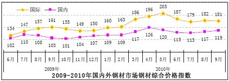 據(jù)中國(guó)鋼鐵工業(yè)協(xié)會(huì)數(shù)據(jù),9 月末國(guó)內(nèi)鋼材綜合價(jià)格指數(shù)119.4,比8 月末上升2.87點(diǎn);據(jù)國(guó)際鋼聯(lián)數(shù)據(jù),9 月末全球鋼材綜合價(jià)格指數(shù)180.5,比8 月末下降1.7 點(diǎn)。