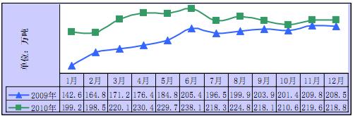 2010 年全年累計,生鐵、粗鋼和鋼材產(chǎn)量分別為 5.90 億噸、6.27 億噸和 7.96 億噸,同比分別增長 7.4%、9.3%和 14.7%,增幅分別比 2009 年回落 8.5 個百分點、4.2 個百分點和3.8 個百分點。