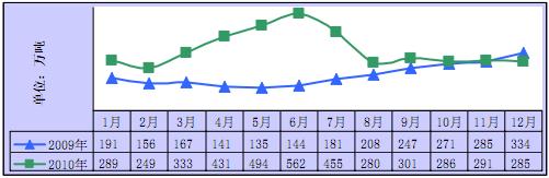 據(jù)海關(guān)快報統(tǒng)計,12 月我國進口鋼材 141 萬噸,同比下降 4.94%,環(huán)比增加 3 萬噸;出口鋼材 285 萬噸,同比下降 14.54%,環(huán)比減少 6 萬噸;凈出口鋼材 144 萬噸,同比下降22.24%,環(huán)比減少 9 萬噸;2010 年全年累計進口鋼材 1643萬噸,同比下降 6.82%,累計出口鋼材 4256萬噸,同比增長 73.03%,累計凈出口 2613 萬噸,同比增長 2.75 倍。
