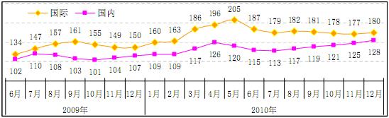 圖 6 2009-2010 年國內(nèi)外鋼材市場鋼材綜合價格指數(shù)