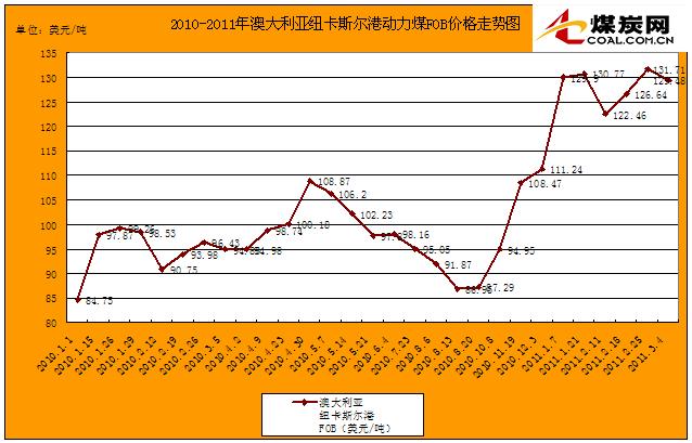 2010-2011年澳大利亞紐卡斯爾港動力煤FOB價格走勢圖