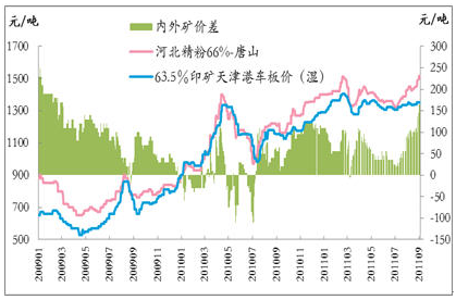 近來由于河北地區(qū)整頓小礦山,致使短期內資源緊張。截至2011年9月2日,河北唐山鐵精粉(66%)為1515元/噸,相比2011年8月2日環(huán)比上漲80元/噸,漲幅達6%;較2010年9月2日,同比上漲305元/噸,漲幅約25%。另63.5%印礦天津港車板價(濕)為1350元/噸,較上月同期環(huán)比上漲10元/噸,漲幅為1%;較去年同期上漲195元/噸,漲幅為17%。內外礦價差為165元/噸,環(huán)比上升70元/噸。
