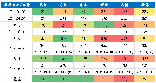 據(jù)MRI成本模型測算,截止2011年9月1日,線材、螺紋、冷軋、鍍鋅四品種的平均盈利空間仍在200元/噸以上,而中板、熱軋偏弱,均不到50元/噸。與2011年8月1日相比,各品種盈利水平環(huán)比紛紛回落。其中冷軋、線材回落幅度較小,而螺紋盈利水平則明顯收窄,縮水115元/噸。與2010年9月1日相比,長材依然表現(xiàn)搶眼,螺紋、線材盈利水平同比增幅均超過260元/噸,而板材各品種均不過百元大關,另冷軋同比更是下降216元/噸。