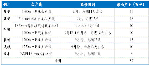 8月中旬日均粗鋼產(chǎn)量為194.7萬噸,環(huán)比上旬繼續(xù)增加。據(jù)Mysteel調查,9月份鋼廠的中厚板訂單雖盈利情況仍不容樂觀,但較前期有所好轉。另8-9月份,鋼廠為限產(chǎn)保價,紛紛加大了檢修力度,尤其是熱軋產(chǎn)線。分品種來看,由于檢修影響熱軋產(chǎn)量約為87萬噸,影響建材產(chǎn)量為30萬噸左右,影響中厚板產(chǎn)量則為25萬噸左右,供給壓力得到明顯緩解。