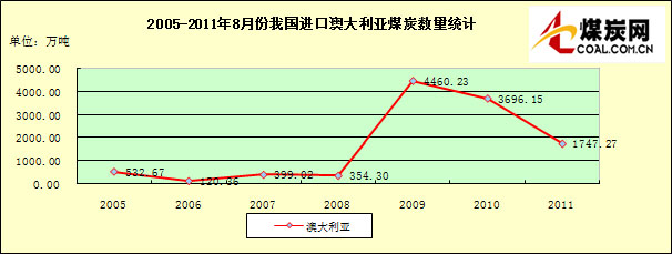 2005-2011年8月份我國進(jìn)口澳大利亞煤炭數(shù)量走勢統(tǒng)計
