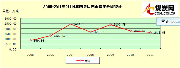 2005-2011年9月份我國進(jìn)口越南煤炭數(shù)量走勢統(tǒng)計(jì)