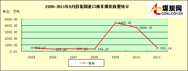 2005-2011年9月份我國進(jìn)口南非煤炭數(shù)量走勢統(tǒng)計(jì)