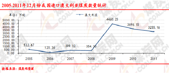 2005-2011年12月份我國進口澳大利亞煤炭數(shù)量走勢統(tǒng)計