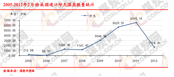 2005-2012年2月份我國進口印尼煤炭數(shù)量走勢統(tǒng)計