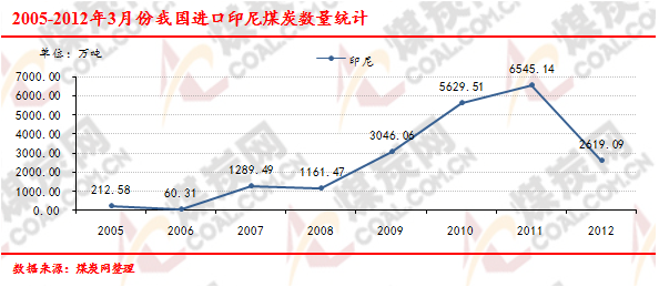 2005-2012年3月份我國(guó)進(jìn)口印尼煤炭數(shù)量走勢(shì)統(tǒng)計(jì)