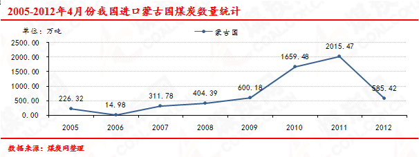 2005-2012年4月份我國進(jìn)口蒙古國煤炭數(shù)量走勢統(tǒng)計(jì)