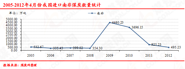 2005-2012年4月份我國進(jìn)口南非煤炭數(shù)量走勢統(tǒng)計(jì)
