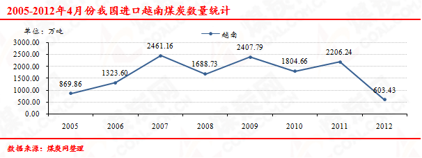 2005-2012年4月份我國進(jìn)口越南煤炭數(shù)量走勢統(tǒng)計(jì)
