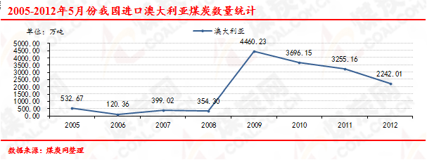 2005-2012年5月份我國進(jìn)口澳大利亞煤炭數(shù)量走勢(shì)統(tǒng)計(jì)