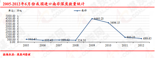 2005-2012年6月份我國(guó)進(jìn)口南非煤炭數(shù)量走勢(shì)統(tǒng)計(jì)