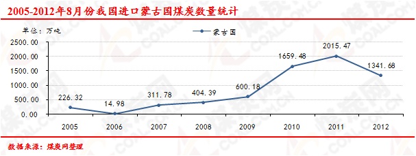 2005-2012年8月份我國(guó)進(jìn)口蒙古煤炭數(shù)量走勢(shì)統(tǒng)計(jì)