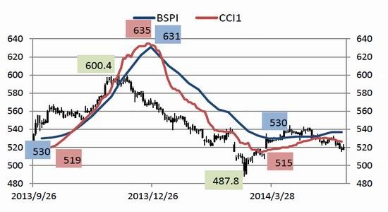 從CCI1指數(shù)來看,該指數(shù)5月份整體波幅也較為有限,從4月下旬開始,指數(shù)由526點上升至530點,近期又出現(xiàn)回落,折回526點附近,體現(xiàn)出現(xiàn)貨市場近期扭頭向下,較為低迷。