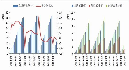 4月國內原煤產量 3.01 億噸,環(huán)比減少 400 萬噸,當月同比下降 1.3% ,2014年1 - 4月原煤累計產量 11.79 億噸,累計同比下降 1 % 。1 - 4月份的原煤產量數(shù)據(jù)為近幾年以來較低水平。