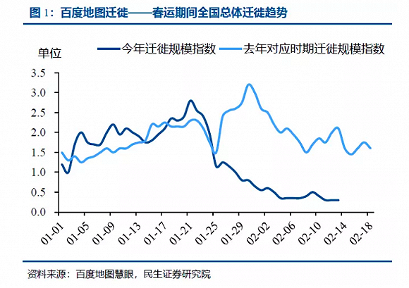 從春運(yùn)期間全國遷移指數(shù)來看,還有大量員工未返回工作所在地。從百度地圖慧眼的數(shù)據(jù)來看,自1月24日武漢封城之后,全國遷移指數(shù)大幅下降,遠(yuǎn)低于去年春運(yùn)同期。自2月3日以來的平均遷移指數(shù)僅為去年同期的20%,還有大量員工未返回工作所在地。