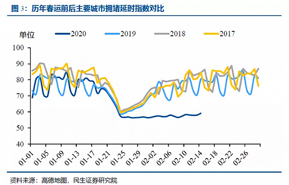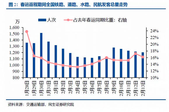 民生宏觀在日前發(fā)布的一份研報(bào)中從包括全國春運(yùn)遷移指數(shù)、全國鐵路、道路、水路、民航發(fā)客總量在內(nèi)的六個角度分析了當(dāng)前的復(fù)工進(jìn)度。