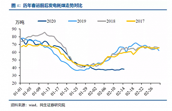 大年初九以來發(fā)電耗煤量明顯低于往年同期。根據(jù)6大發(fā)電集團(tuán)發(fā)電耗煤量走勢,今年春節(jié)第二周以來,日均發(fā)電耗煤量明顯低于往年春節(jié)同期,至今沒有向上趨勢。發(fā)電耗煤量走勢反映工業(yè)生產(chǎn)情況,發(fā)電耗煤量持續(xù)低迷體現(xiàn)出工業(yè)領(lǐng)域復(fù)工率較低的事實(shí)。