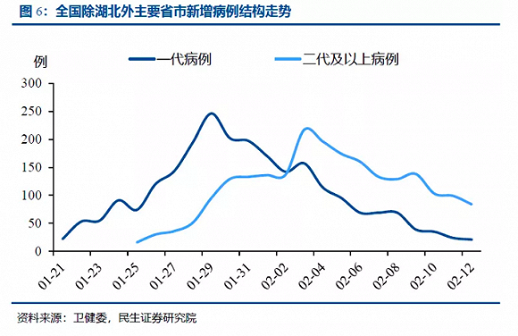 非湖北地區(qū)二代以上病例占比在提升,復(fù)工后防疫壓力較大。對全國主要省市而言,隨著自春節(jié)以來14天隔離期結(jié)束,非湖北地區(qū)新增一代病例(湖北輸入型病例)逐漸下降,但新增二代以上病例占比逐漸增多,成為新增病例主要來源。說明新冠肺炎在全國非湖北地區(qū)有二次傳播的現(xiàn)象。