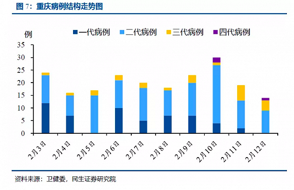 很多城市出現(xiàn)三代甚至四代病例,防疫責(zé)任仍然較大。包括重慶、溫州等多個城市均出現(xiàn)一定規(guī)模的三代甚至四代病例,這意味著這些城市疫情出現(xiàn)多輪傳播,且二代以上病例傳播路徑追蹤較為困難,地方仍然承擔(dān)著較大的防疫責(zé)任和壓力。