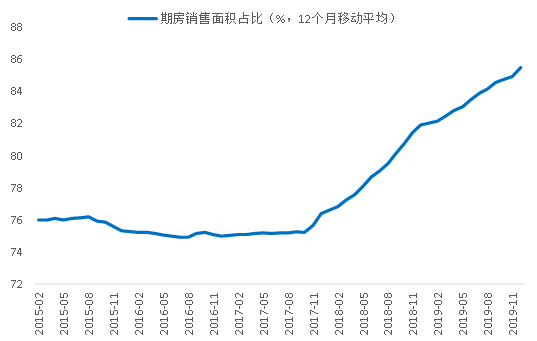 第二,降低商品房的預(yù)售條件,便利房企銷售回款。2017年四季度期房銷售面積占比開始回升,2019年12月達到了85%。如此高的占比,預(yù)售標準調(diào)整對房企銷售回款,有著重要影響。因此,在降低購房門檻的同時,也應(yīng)該降低預(yù)售商品房的標準。