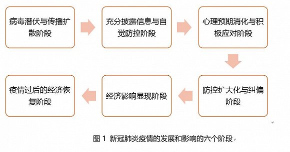 更詳細(xì)的疫情發(fā)展和影響可分為以下六個階段:病毒潛伏與傳播擴(kuò)散階段、充分披露信息與自覺防控階段、心理預(yù)期消化與積極應(yīng)對階段、防控擴(kuò)大化與糾偏階段、經(jīng)濟(jì)影響顯現(xiàn)階段、疫情過后的經(jīng)濟(jì)恢復(fù)階段。