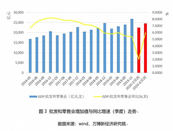 批發(fā)零售業(yè):預(yù)計(jì)三、四季度將全面恢復(fù),同比增長均為5.8%,全年預(yù)計(jì)批零增加值為10.1萬億元,全年增速約為5%。