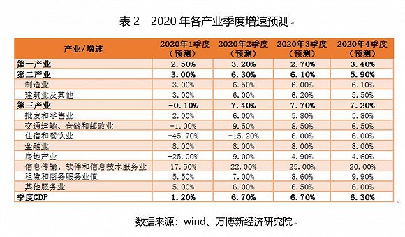 以上預(yù)測已經(jīng)包含了疫情沖擊下的替代性增長,創(chuàng)新性增長、增長延遲和政府已經(jīng)出臺的穩(wěn)增長措施的影響。比如,在批發(fā)零售業(yè)評估中,充分考慮了線上消費(fèi)對線下消費(fèi)的替代;在信息技術(shù)等相關(guān)行業(yè)預(yù)測中,充分考慮了疫情的沖擊會加快5G通信、云計(jì)算、人工智能、機(jī)器人、工業(yè)互聯(lián)網(wǎng)等行業(yè)的增長;在制造業(yè)和建筑業(yè)預(yù)測中,也包含了延遲增長和政府已經(jīng)出臺的穩(wěn)增長政策所產(chǎn)生的對沖效應(yīng),其中新增專項(xiàng)債、減免企業(yè)社保、保險費(fèi)、緩繳住房公積金等政策對于提振企業(yè)信心的積極效果等因素,全年對GDP的拉動作用有望達(dá)到0.3個百分點(diǎn)左右。