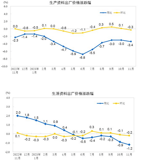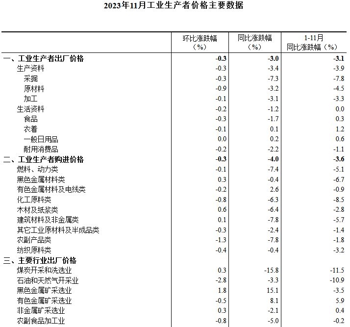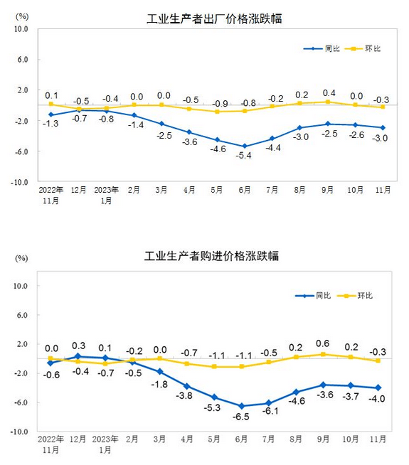 2023年11月份,全國工業(yè)生產(chǎn)者出廠價格同比下降3.0%,環(huán)比下降0.3%;工業(yè)生產(chǎn)者購進價格同比下降4.0%,環(huán)比下降0.3%。1—11月平均,工業(yè)生產(chǎn)者出廠價格比上年同期下降3.1%,工業(yè)生產(chǎn)者購進價格下降3.6%。