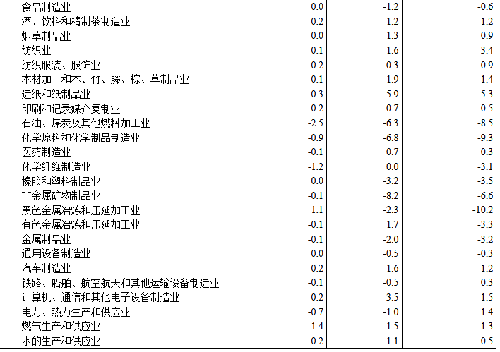 工業(yè)生產(chǎn)者出廠價格中,生產(chǎn)資料價格下降0.3%,影響工業(yè)生產(chǎn)者出廠價格總水平下降約0.24個百分點。其中,采掘工業(yè)價格下降0.3%,原材料工業(yè)價格下降0.9%,加工工業(yè)價格下降0.1%。生活資料價格下降0.2%,影響工業(yè)生產(chǎn)者出廠價格總水平下降約0.05個百分點。其中,食品價格下降0.3%,衣著價格下降0.1%,一般日用品價格持平,耐用消費品價格下降0.2%。