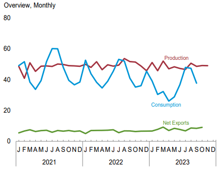 1月29日,美國能源信息署(EIA)發(fā)布最新《月度能源回顧》顯示,2023年12月份,美國煤炭產(chǎn)量為4694萬短噸(4258.33萬噸),較上年同期的4567.3萬短噸增長2.77%,較前一月的4895.1萬短噸下降4.1%。
