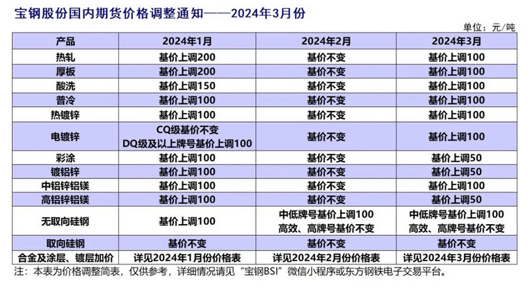 經(jīng)研究決定,寶鋼股份板材內(nèi)銷價(jià)格2024年3月份在2024年2月份基礎(chǔ)上調(diào)整公告如下(以下除特殊注明外,均為不含稅):