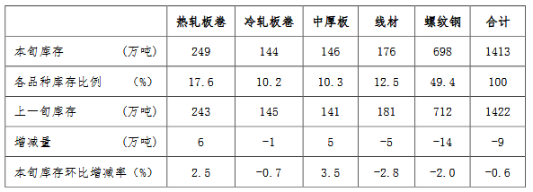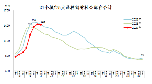 3月中旬,21個(gè)城市5大品種鋼材社會(huì)庫存1413萬噸,環(huán)比減少9萬噸,下降0.6%,庫存連續(xù)8旬上升后轉(zhuǎn)為下降;比年初增加684萬噸,上升93.8%;比上年同期增加141萬噸,上升11.1%。