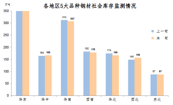 3月中旬,分地區(qū)來看,七大區(qū)域庫存環(huán)比各有升降,具體情況為:西北庫存環(huán)比增加8萬噸,上升5.4%,為增量和升幅最大地區(qū);華中增加2萬噸,上升1.2%;東北環(huán)比基本持平;華北減少8萬噸,下降4.6%,為減量和降幅最大地區(qū);華南減少5萬噸,下降1.6%;西南減少4萬噸,下降2.2%;華東減少2萬噸,下降0.6%。