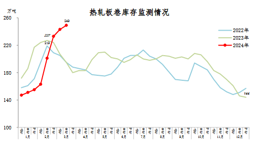 3月中旬,熱軋板卷庫存249萬噸,環(huán)比增加6萬噸,上升2.5%,庫存連續(xù)上升;比年初增加105萬噸,上升72.9%;比上年同期增加54萬噸,上升27.7%。