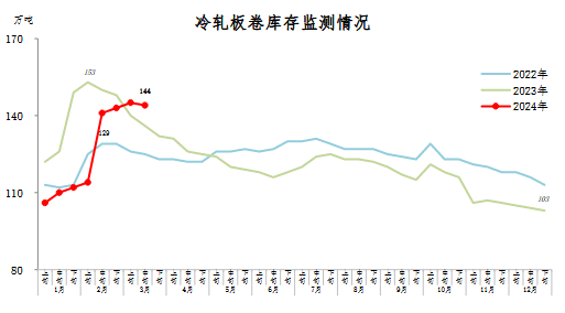 3月中旬,冷軋板卷庫存144萬噸,環(huán)比減少1萬噸,下降0.7%,庫存由升轉(zhuǎn)降;比年初增加41萬噸,上升39.8%;比上年同期增加8萬噸,上升5.9%。