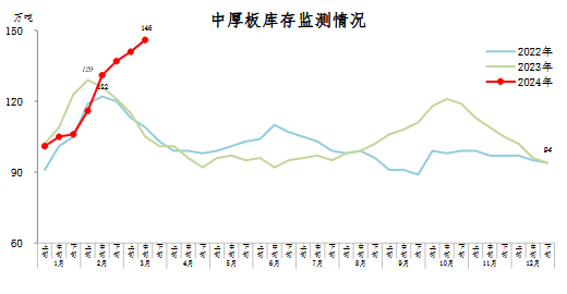 3月中旬,中厚板庫存146萬噸,環(huán)比增加5萬噸,上升3.5%,庫存增幅有所擴(kuò)大;比年初增加52萬噸,上升55.3%;比上年同期增加41萬噸,大幅上升39.0%。